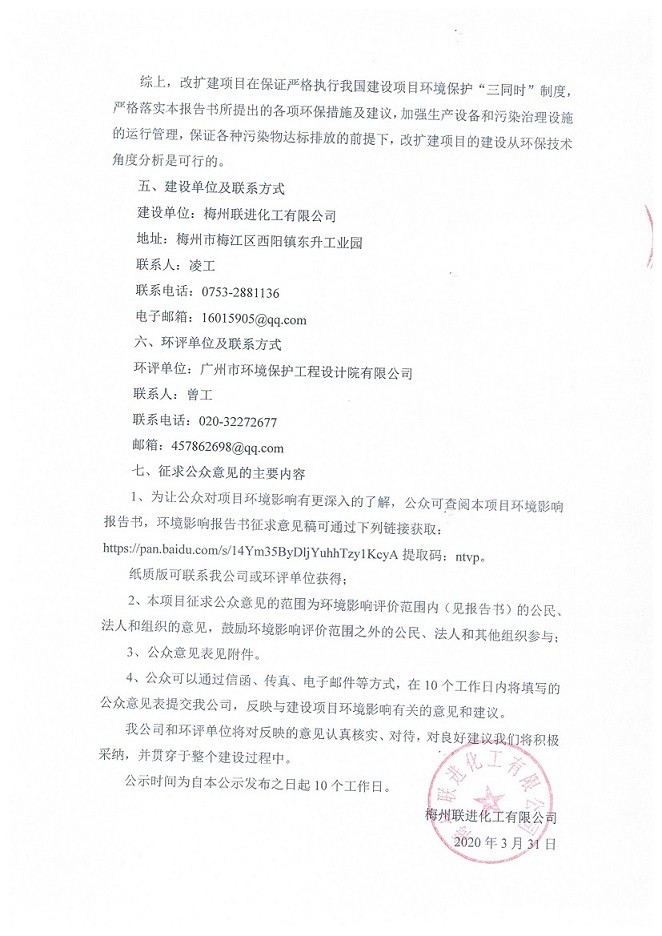 梅州聯(lián)進(jìn)化工有限公司改擴(kuò)建項(xiàng)目環(huán)境影響評價(jià)公眾參與第二次公示